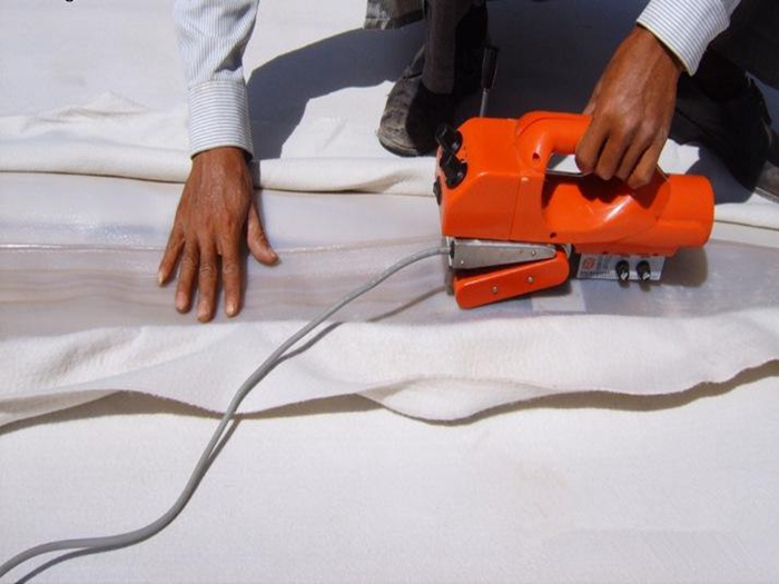 复合土工膜铺设分渠底铺设、坡面铺设两个部分。铺设方法:沿渠道轴线方向水平滚铺。铺设完成后,应尽量减少在膜面上行走、搬动工具等,凡能对防渗膜造成危害的物件,均不应放在膜上或携带在膜上行走,以免对膜造成意外损伤。坡面铺设在坡面验收合格后,从顺坡面轴线方向滚铺,与渠底的复合土工膜连接采用丁字形连接。铺设应在干燥和暖天气进行,为了便于拼接,防止应力集中,铺设采用波浪形松弛方式,富余度约为1.5%,摊开后及时拉平,拉开,要求膜与坡面吻合平整,无突起褶皱,施工人员应穿平底布鞋或软胶鞋,严禁穿钉鞋,以免踩坏,施工时如发现土工膜损坏,应及时修补。